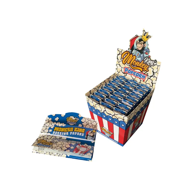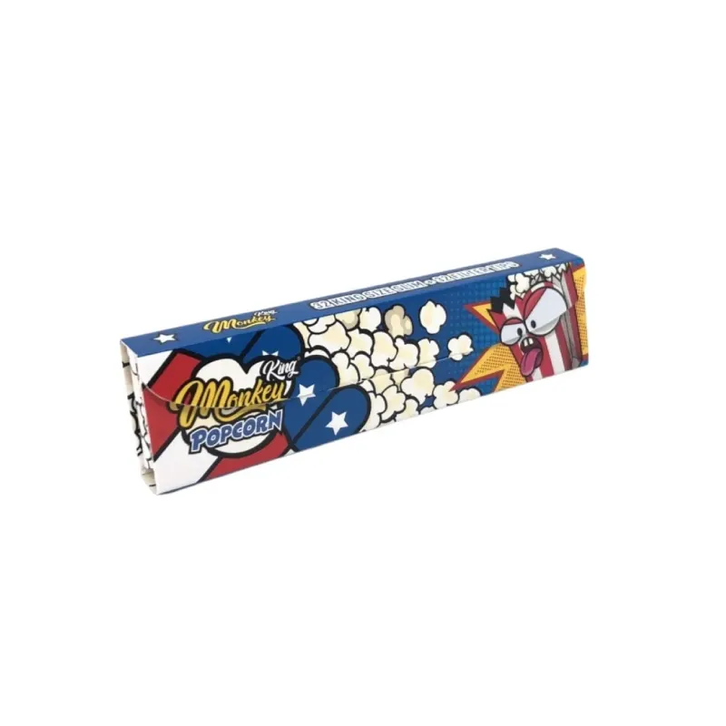 Combipack de 32 hojas y 32 tips. Papel King Size Slim (108 mm) unbleached, Filter tips pre-cortados unbleached (51 x 25 mm). Con olor a POPCORN en el packaging.