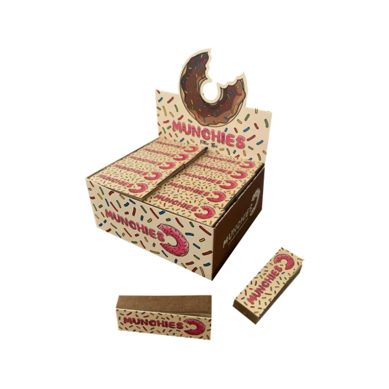 Filtros de cartón de 140g sin blanquear con pre-troquelado para facilitar la forma del filtro y mejorar la filtración. Medidas: 20 x 60 mm. Diseño edición especial "Munchies".